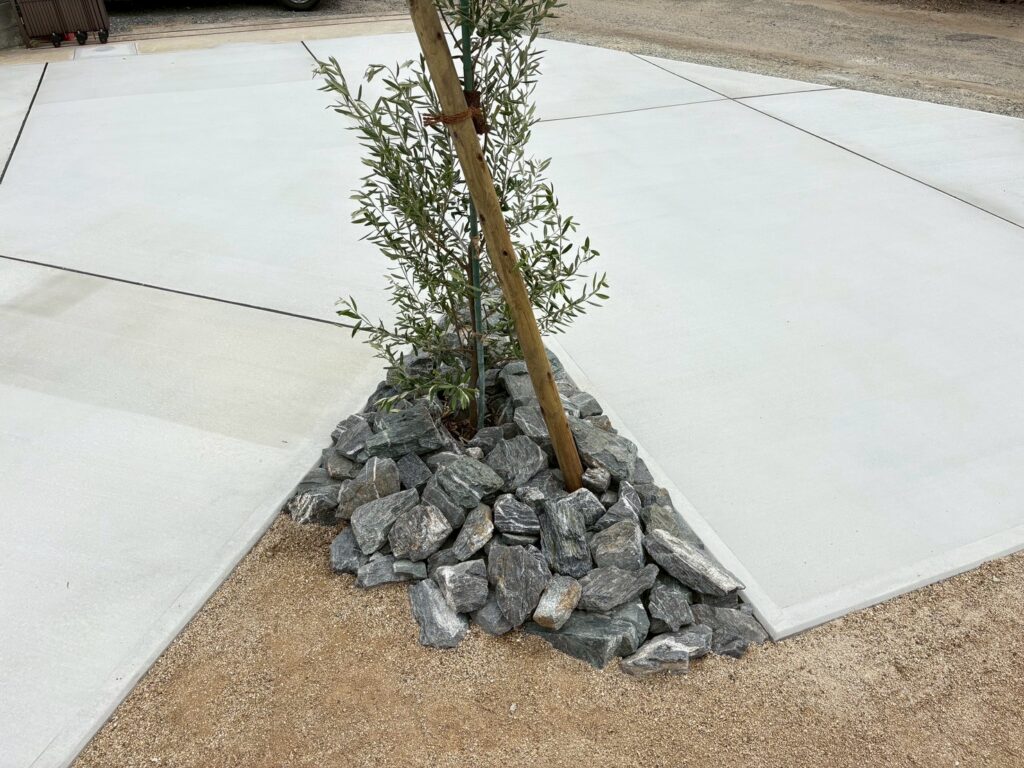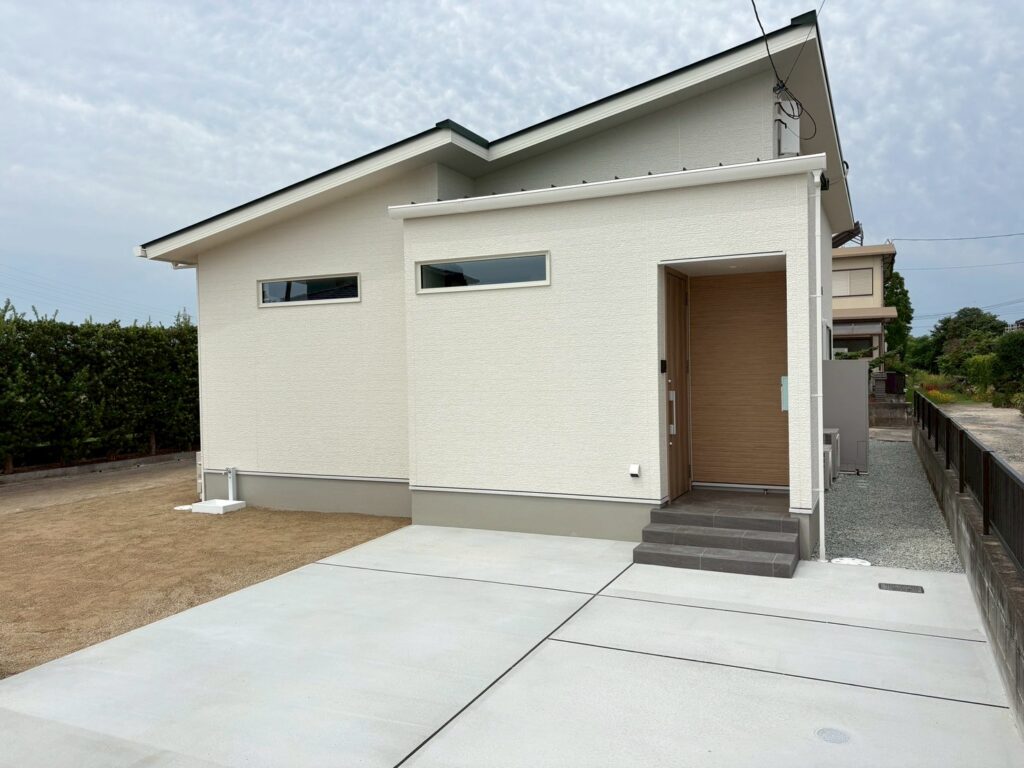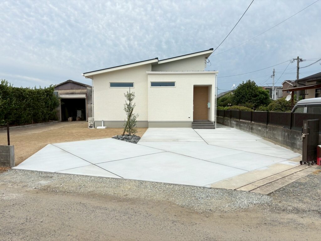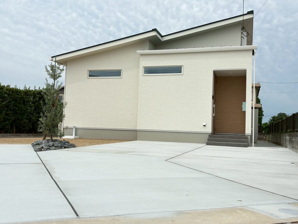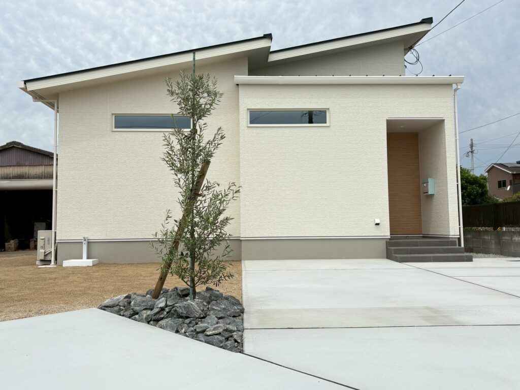 広々としたコンクリートのアプローチに、オリーブの木がさりげなくアクセントを添える外構。シャープなラインが洗練された印象を与え、ナチュラルモダンなテイストに仕上がりました。余白を楽しむ設計で、家族の成長にもゆとりを感じられる空間です。駐車もしやすく、使い勝手も◎。シンプルだけど、どこか心地いい。そんな外構をお探しの方にぴったりです。