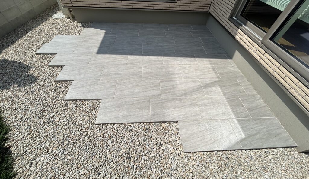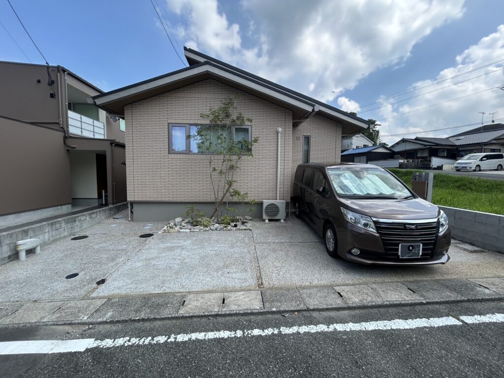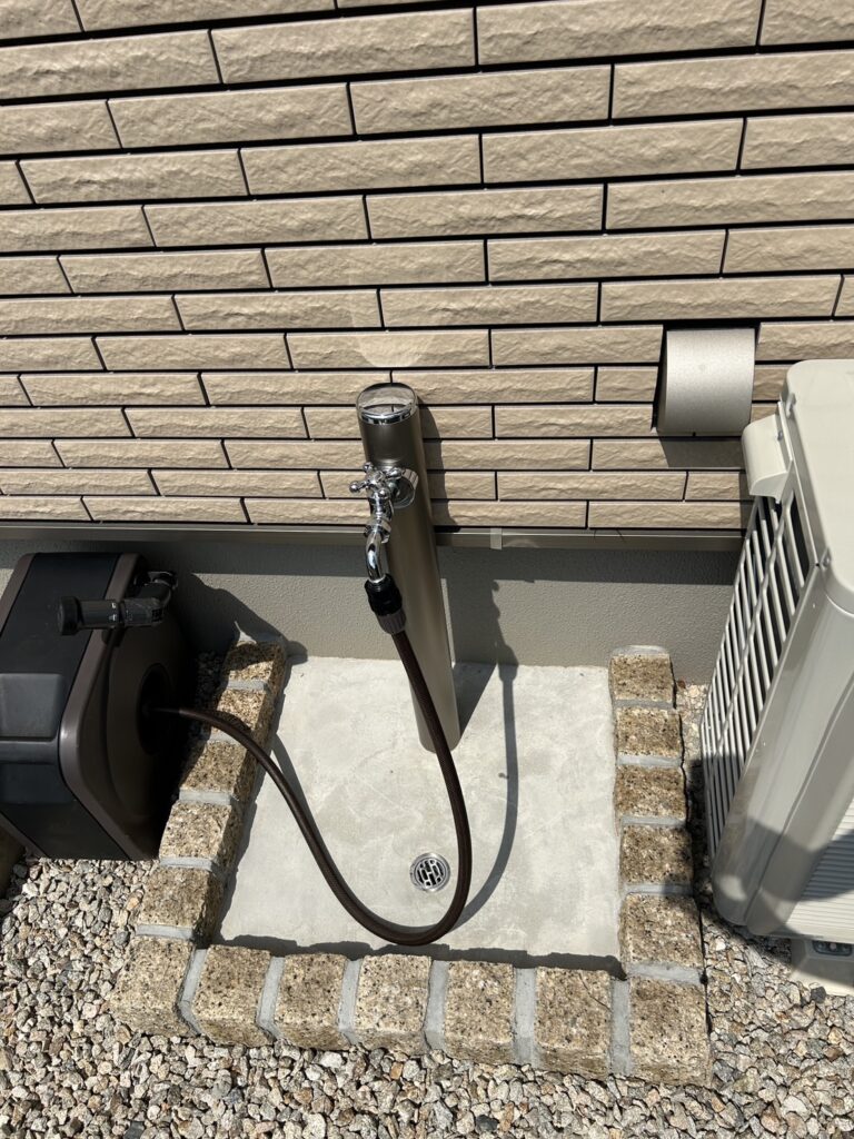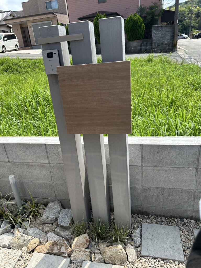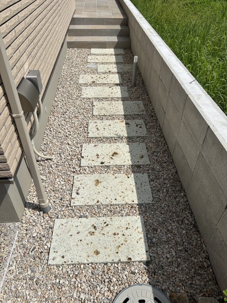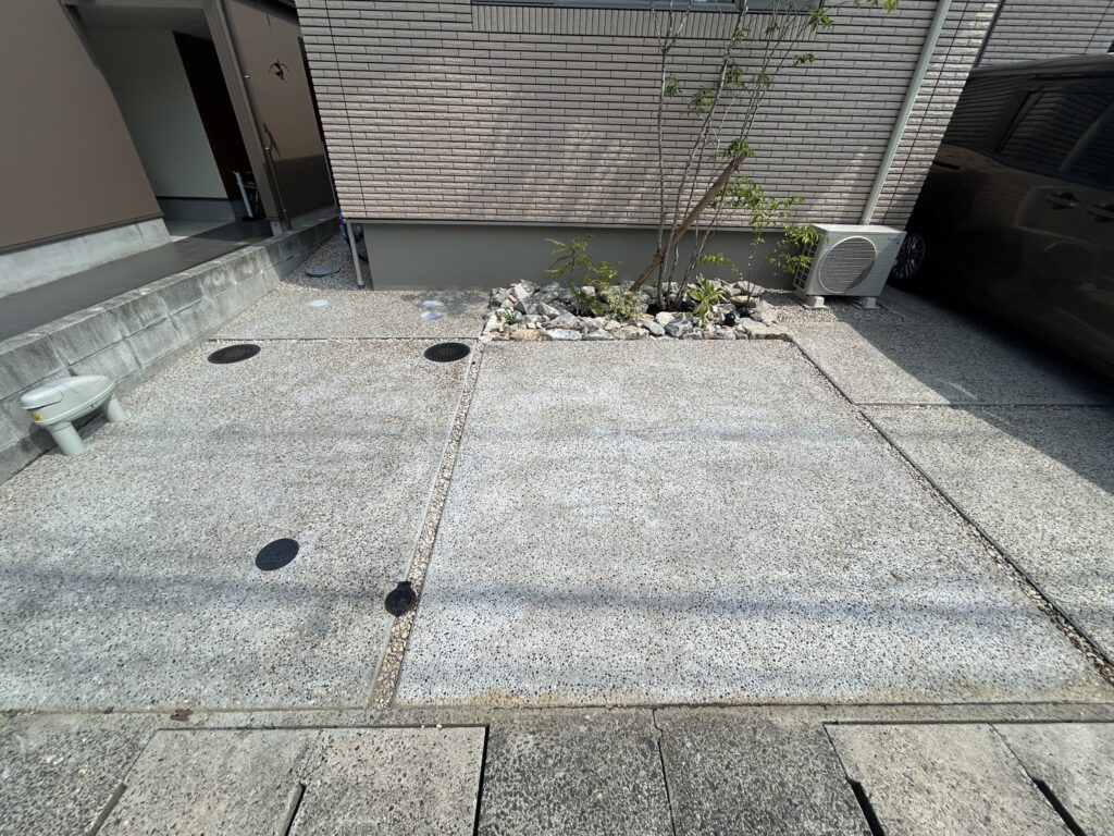 優しい色合いのタイルと洗い出し仕上げの土間が、ナチュラルで落ち着いた雰囲気を演出してくれる外構です。アプローチには自然石の平板を敷き、歩くたびに心地よさを感じられる小道に。門柱まわりには石と植栽をバランスよく配置し、やわらかな印象に仕上げました。子育て世代にもぴったりな、安心感とデザイン性を両立した空間です。おしゃれで機能的な外構をお探しの方におすすめです。