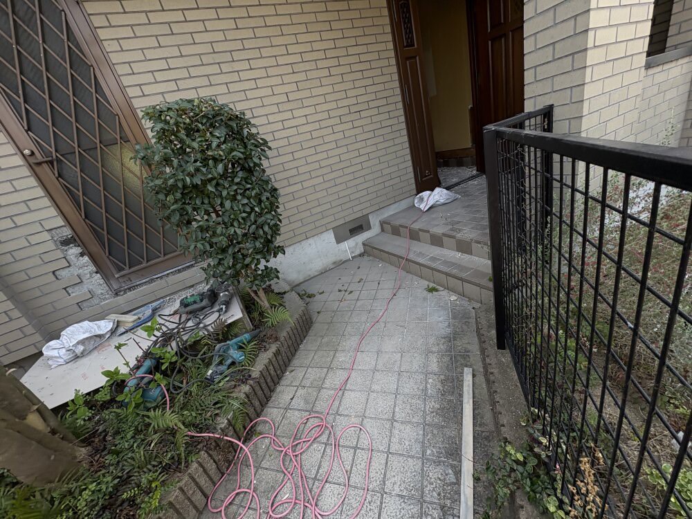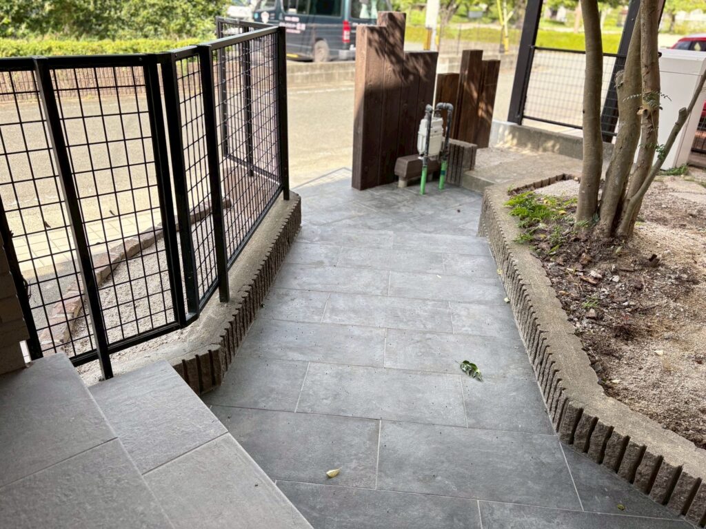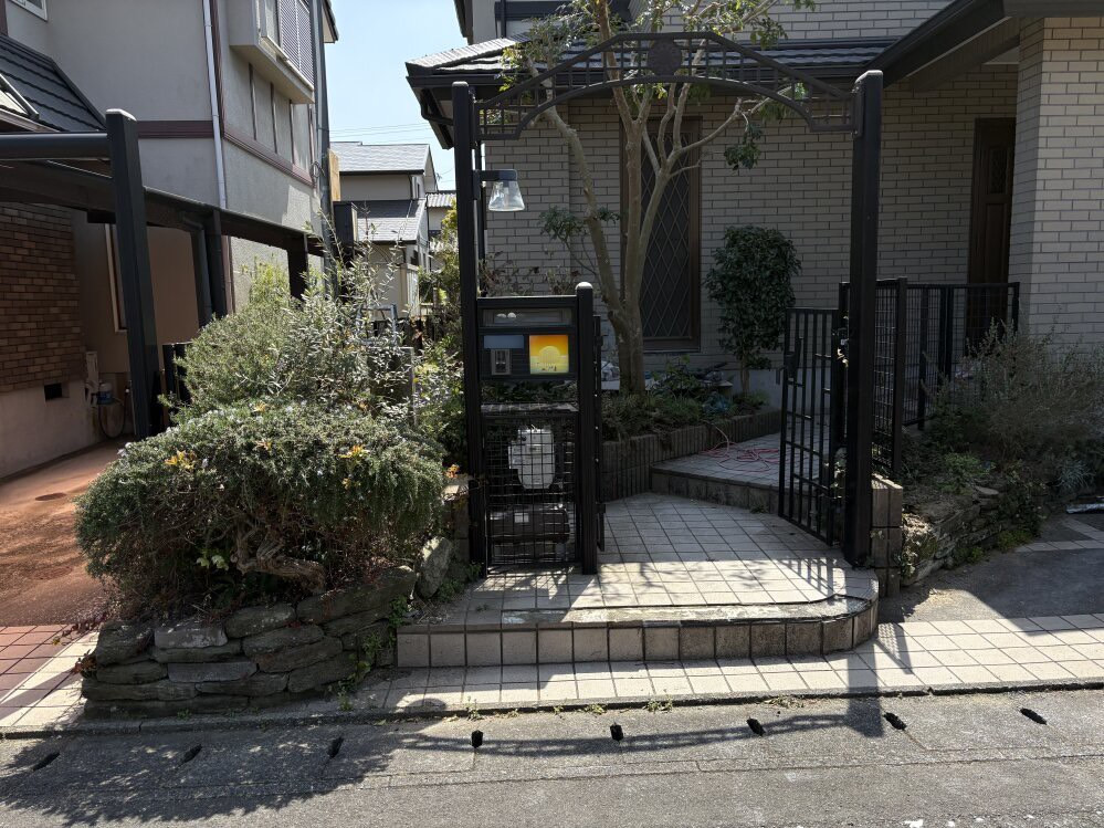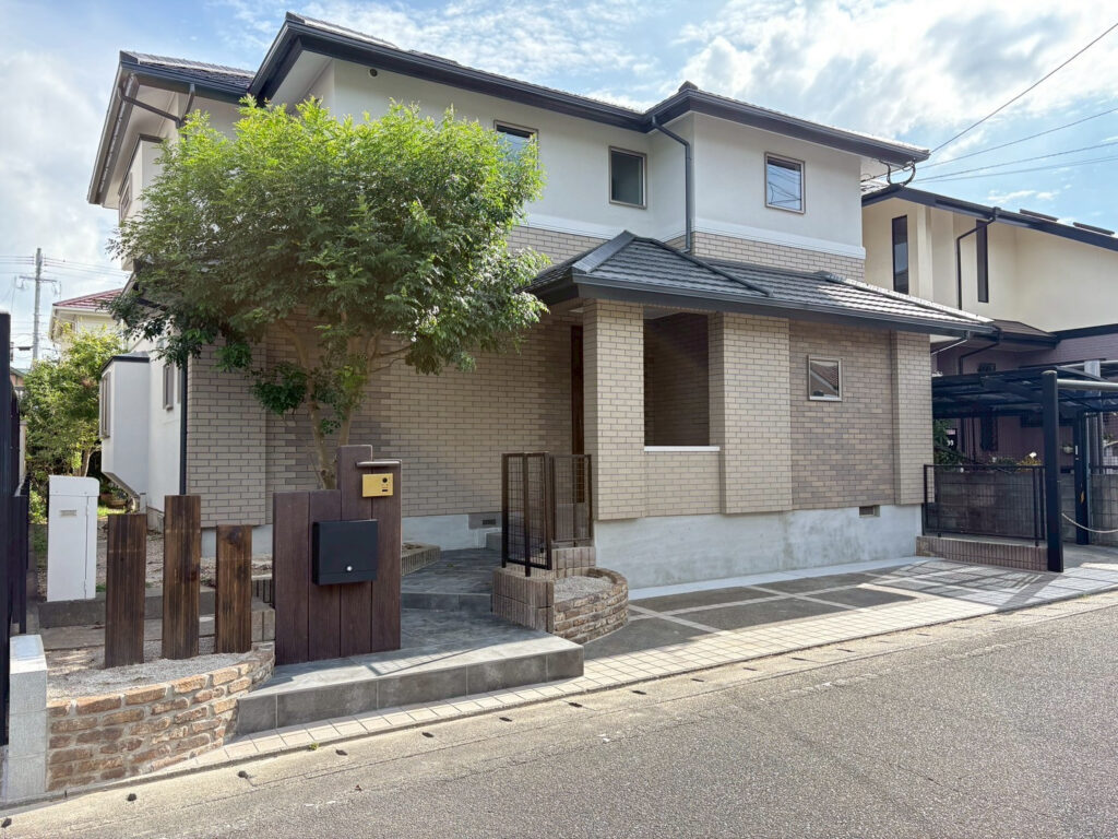 玄関まわりを、温かみのある素材でナチュラルにリメイクしました。石目調のタイルは上品で落ち着いた印象に仕上がり、木調の門柱がやさしくアクセントを添えています。レンガや植栽スペースもバランスよく配置され、自然体でおしゃれな暮らしを叶えたいご家族におすすめです。
