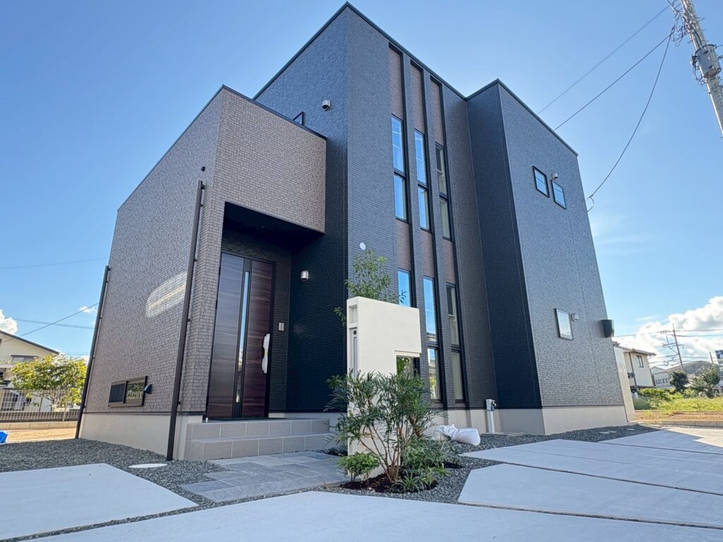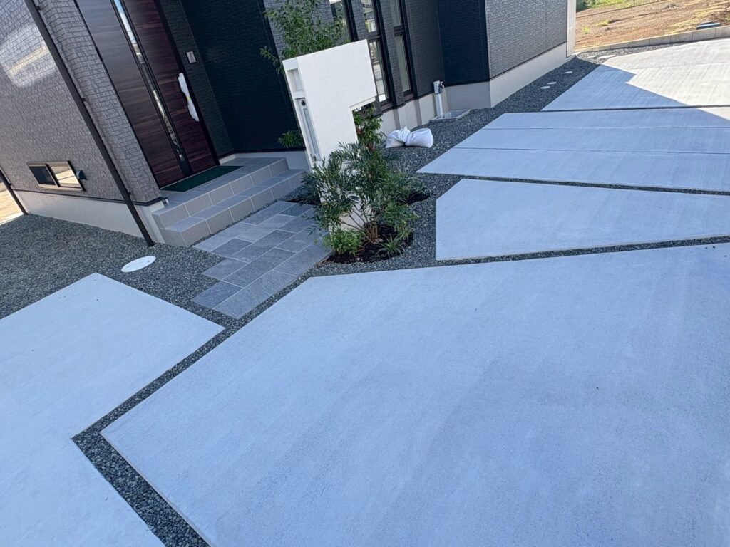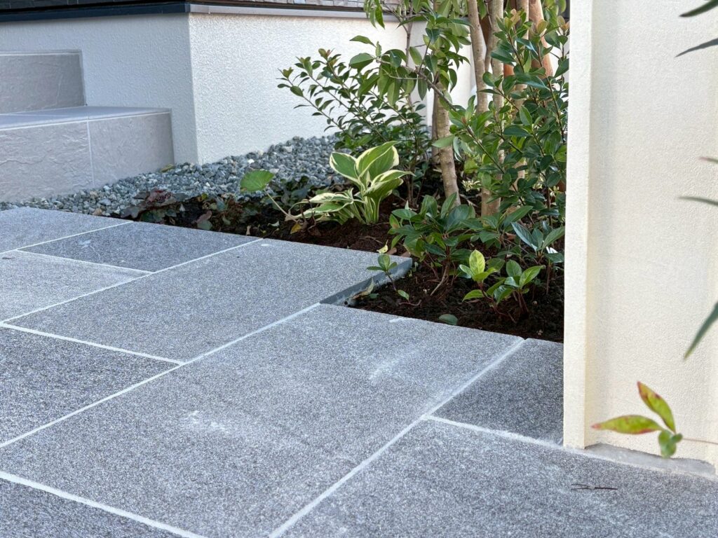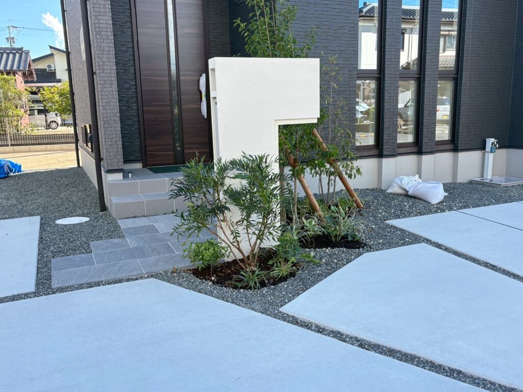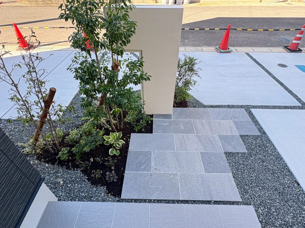 ゆったりと広がる敷石アプローチと、スタイリッシュな門柱が印象的な外構です。直線と斜めラインを組み合わせたデザインが、シンプルながらも人とは違う”特別感”を演出。モノトーンを基調とした落ち着いた雰囲気の中に、植栽の彩りがやさしく映えます。ナチュラルモダンな空間で、毎日の帰宅がちょっと楽しみになるようなお庭に仕上がりました。オリジナリティのある外構をお考えの方におすすめです。