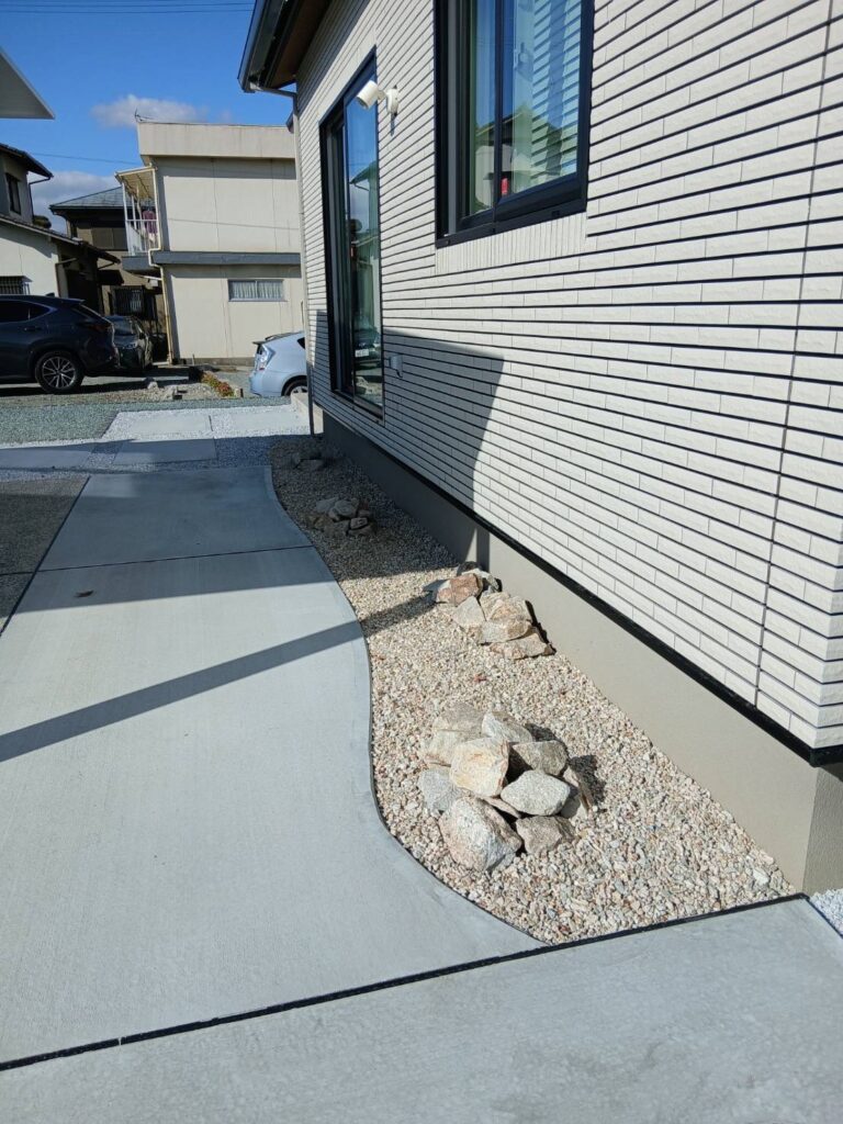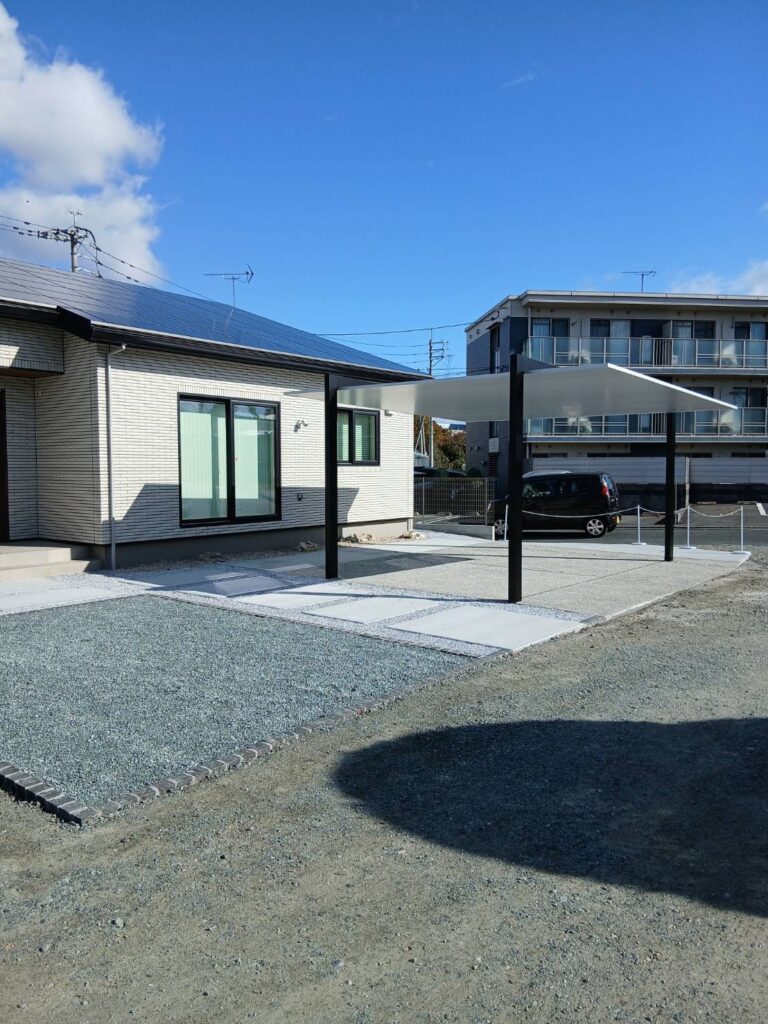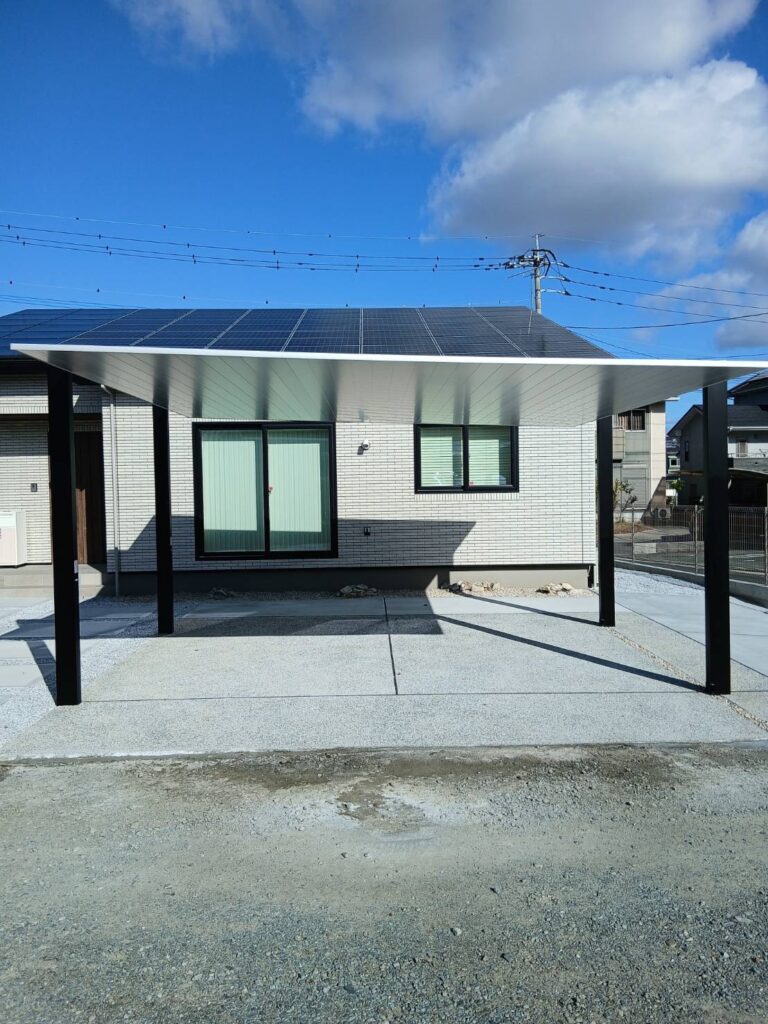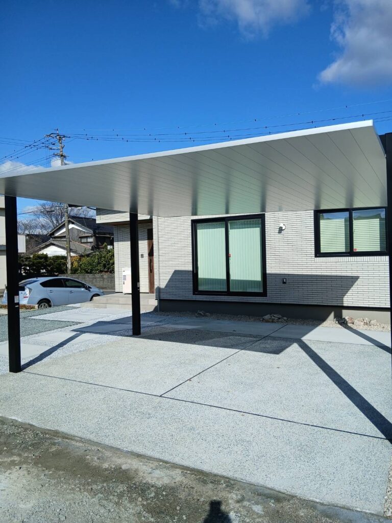 スタイリッシュな片流れ屋根のカーポートが印象的な、洗練されたモダン外構です。敷地全体を明るいカラーの土間コンクリートと砂利でまとめ、直線的なラインがすっきりとした美しさを演出しています。動線も確保されていて、毎日の出入りがとてもスムーズ。ナチュラルな石材をアクセントに使い、どこかやさしさも感じられる仕上がりに。シンプルだけどセンスが光る、そんな空間に仕上がりました。
