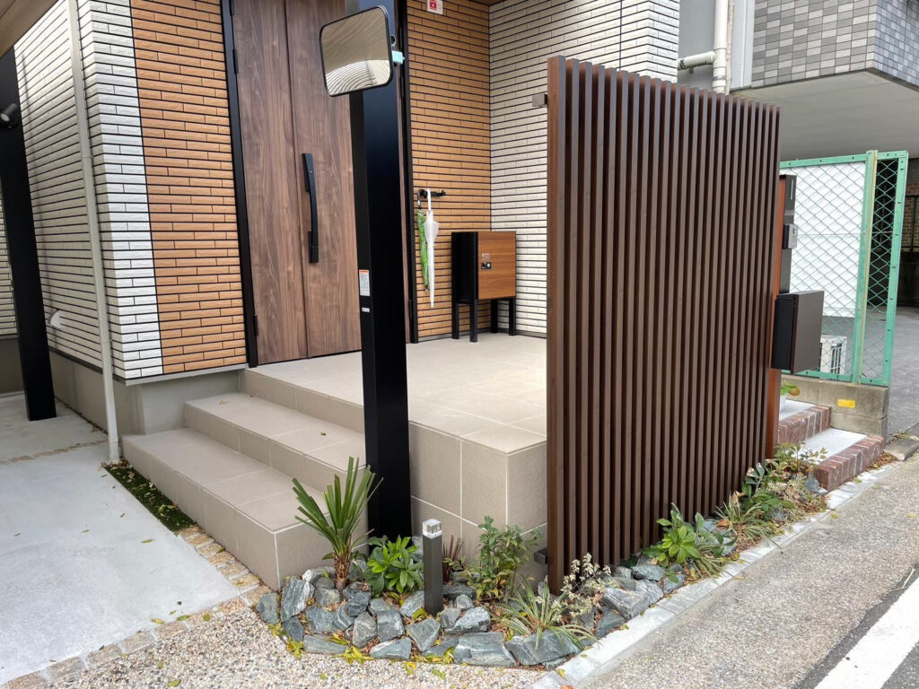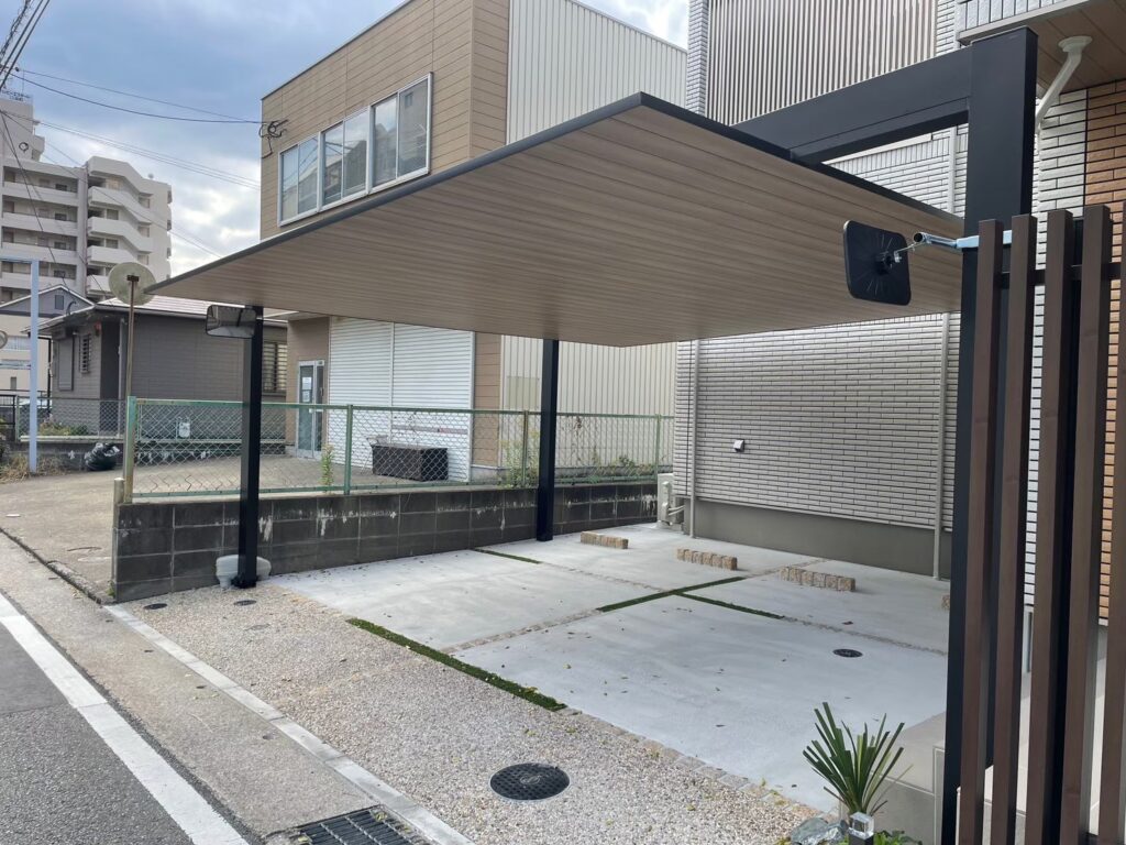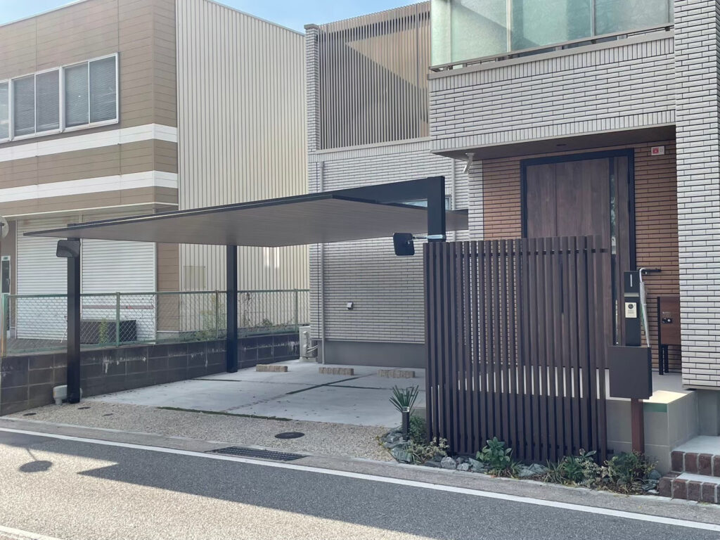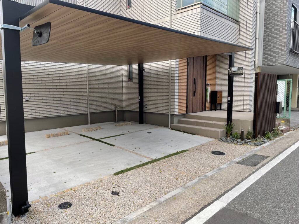 木目調のカーポートがやさしく映える、ナチュラルモダンな外構デザイン。縦格子の門袖はさりげなく視線を遮りながら、玄関まわりを上品に引き立ててくれます。足元にはロックガーデン風の植栽を添え、どこかホッとするようなやわらか雰囲気に。そんな毎日が自然とはじまるご家族の新しい暮らしにぴったりの外構です。