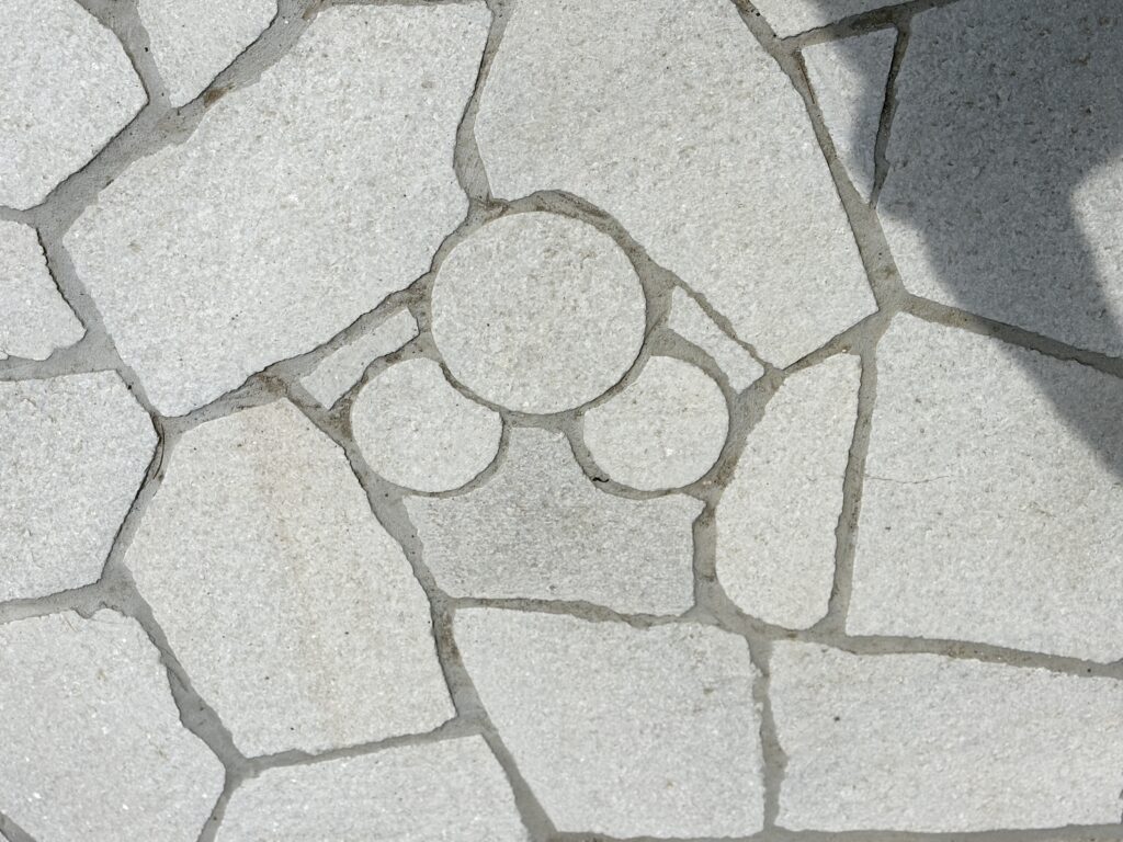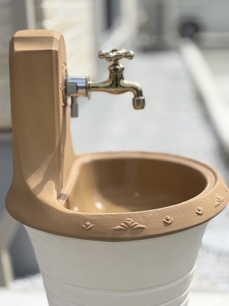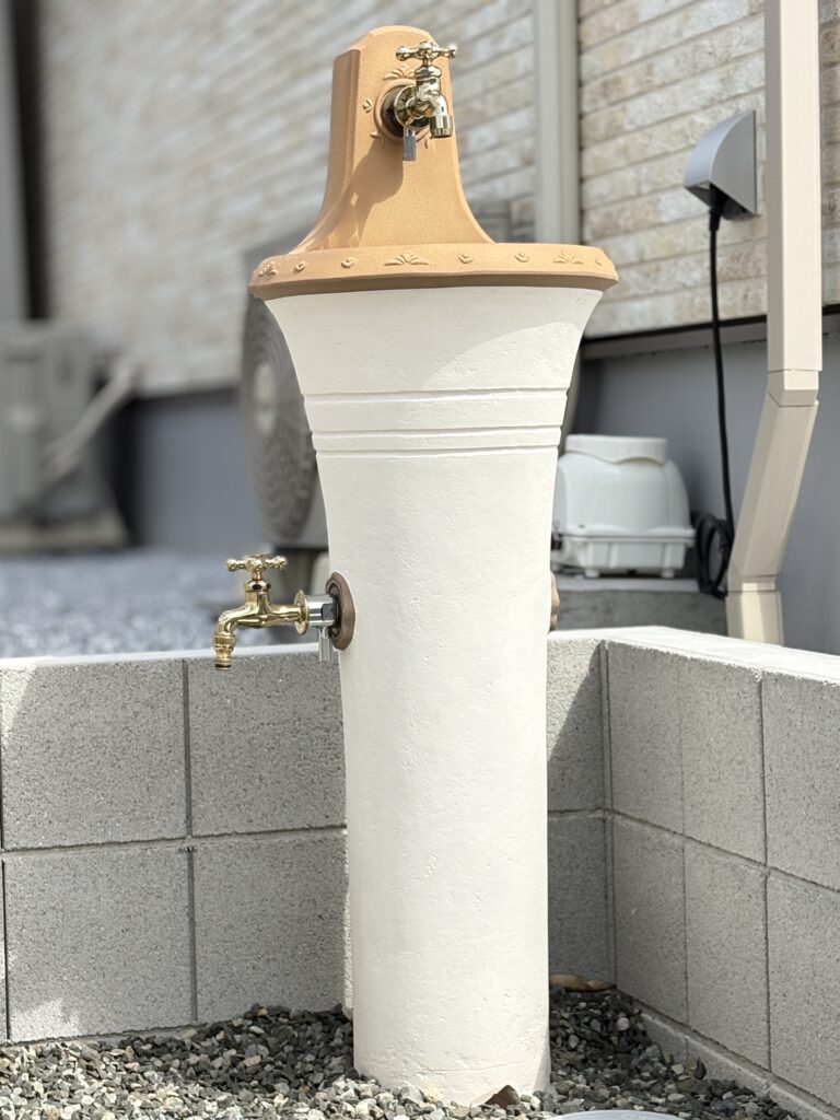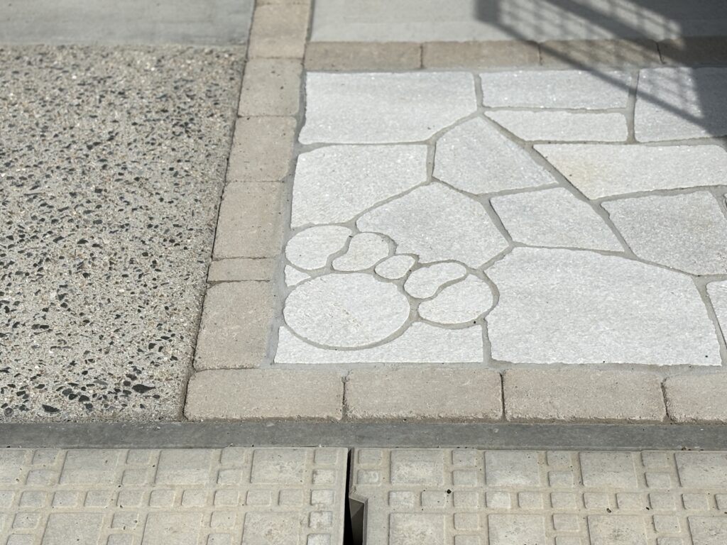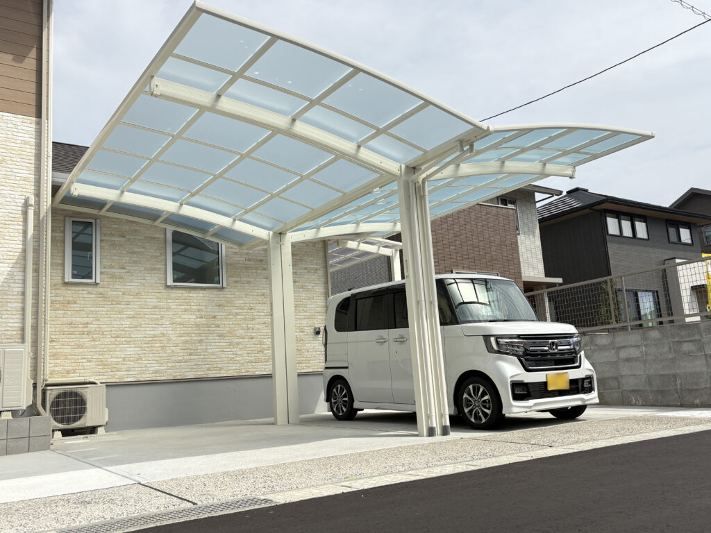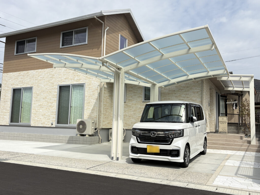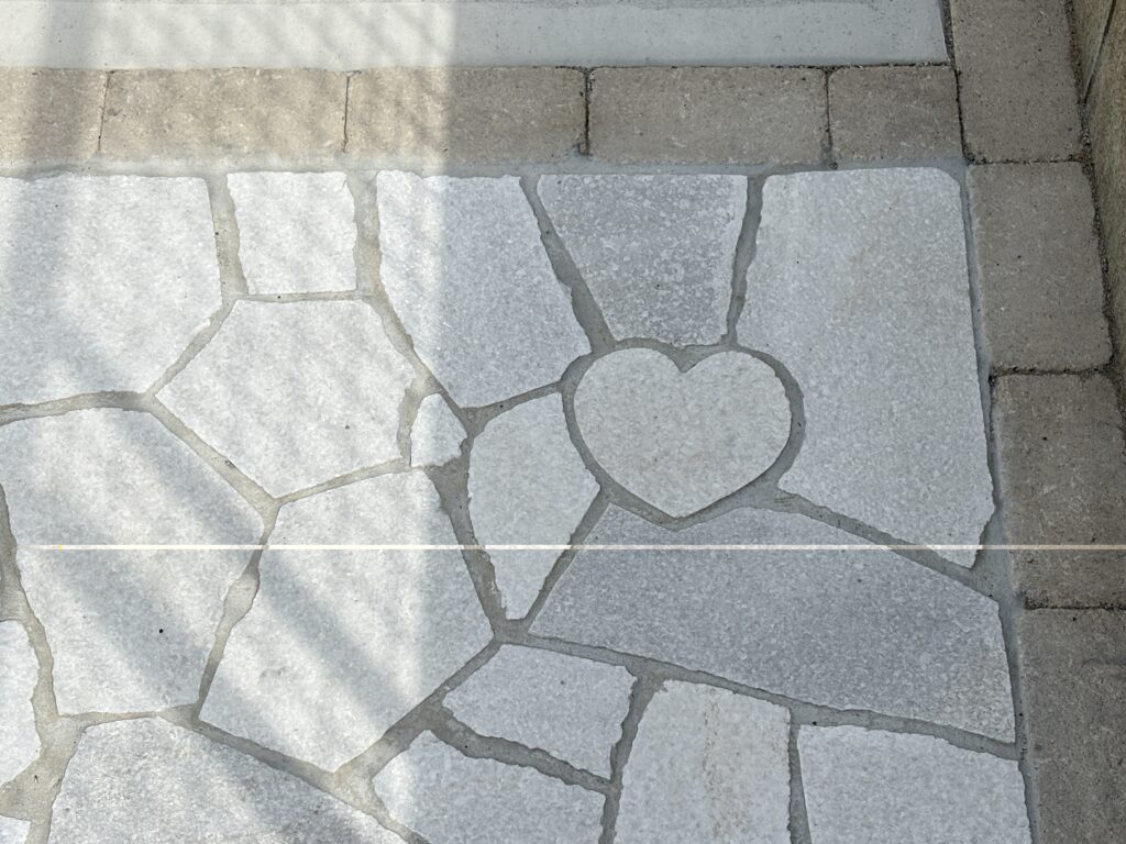 やさしい色合いの石張りアプローチの中に、さりげなく入れたキャラクターモチーフが可愛らしい外構です。毎日通るたびに思わず笑顔になる、遊び心のあるワンポイントに仕上がりました。明るいカーポートで駐車スペースも快適に使え、可愛らしい立水栓も外まわりのアクセントに。白色にこだわったナチュラルでやわらかな雰囲気が、ご家族の暮らしをやさしく彩ってくれます。